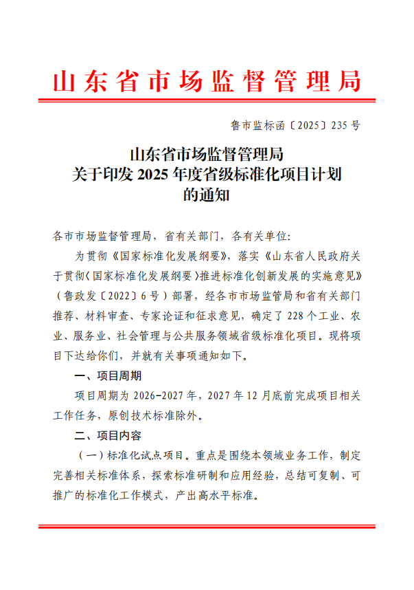 为贯彻《国家标准化发展纲要》,落实《山东省人民政府关于贯彻<国家标准化发展纲要>推进标准化创新发展的实施意见》(鲁政发〔2022]6号)部署,经各市市场监管局和省有关部门推荐、材料审查、专家论证和征求意见,确定了228 个工业、农业、服务业、社会管理与公共服务领域省级标准化项目。
