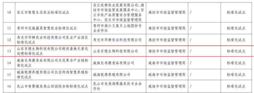其中山东百德生物科技有限公司《病死畜禽无害化处理项目》入选山东省标准化试点项目。